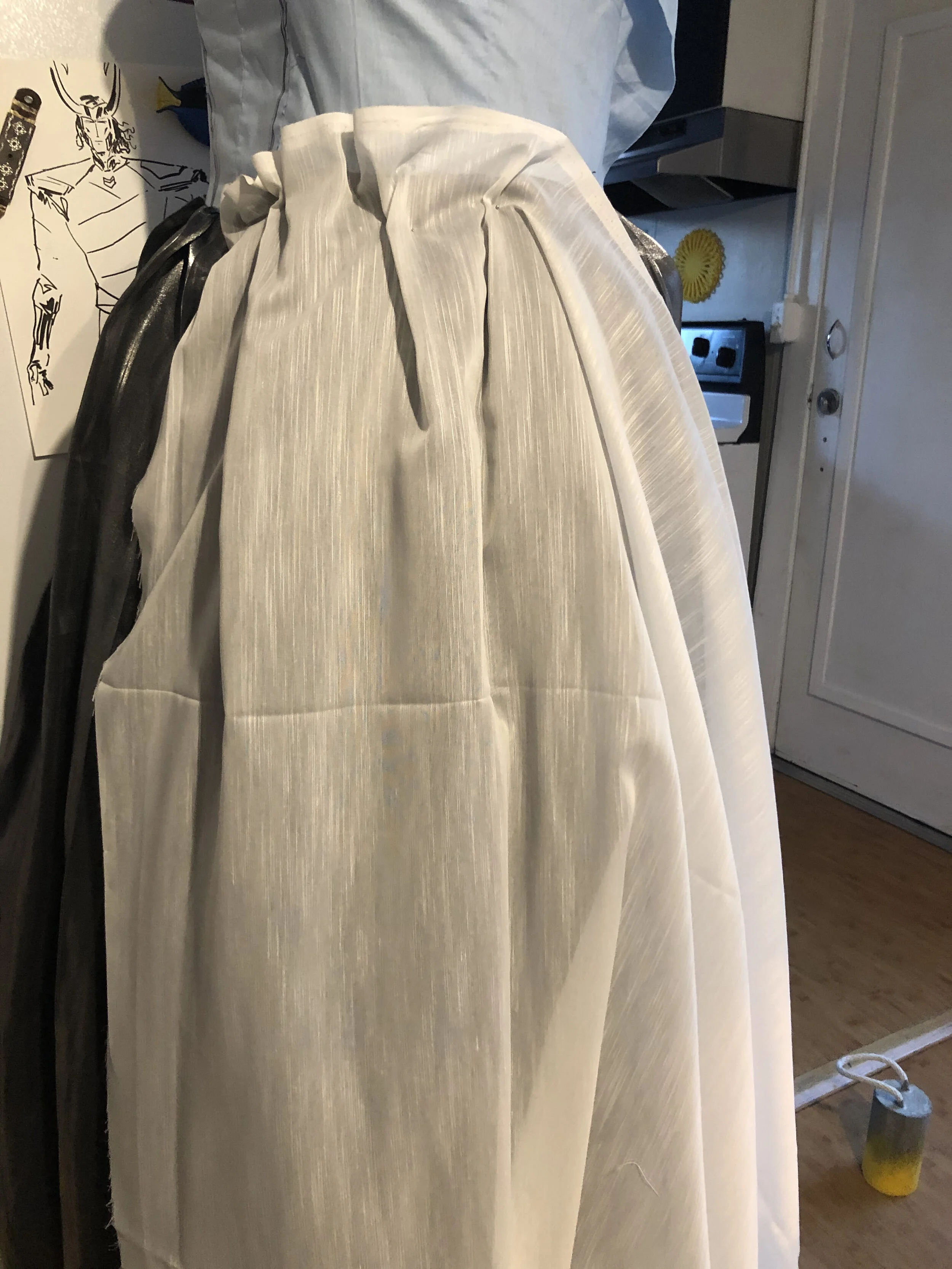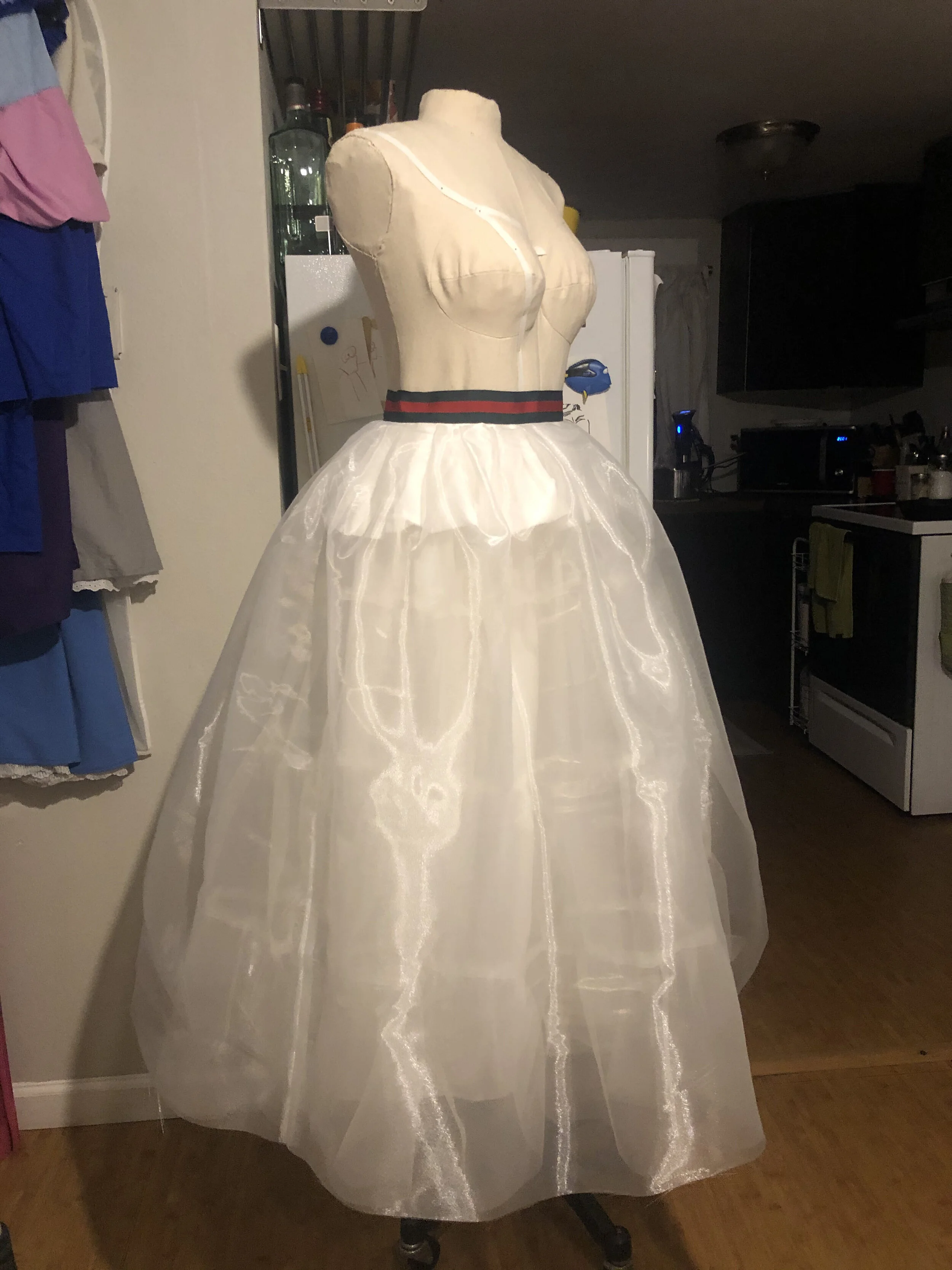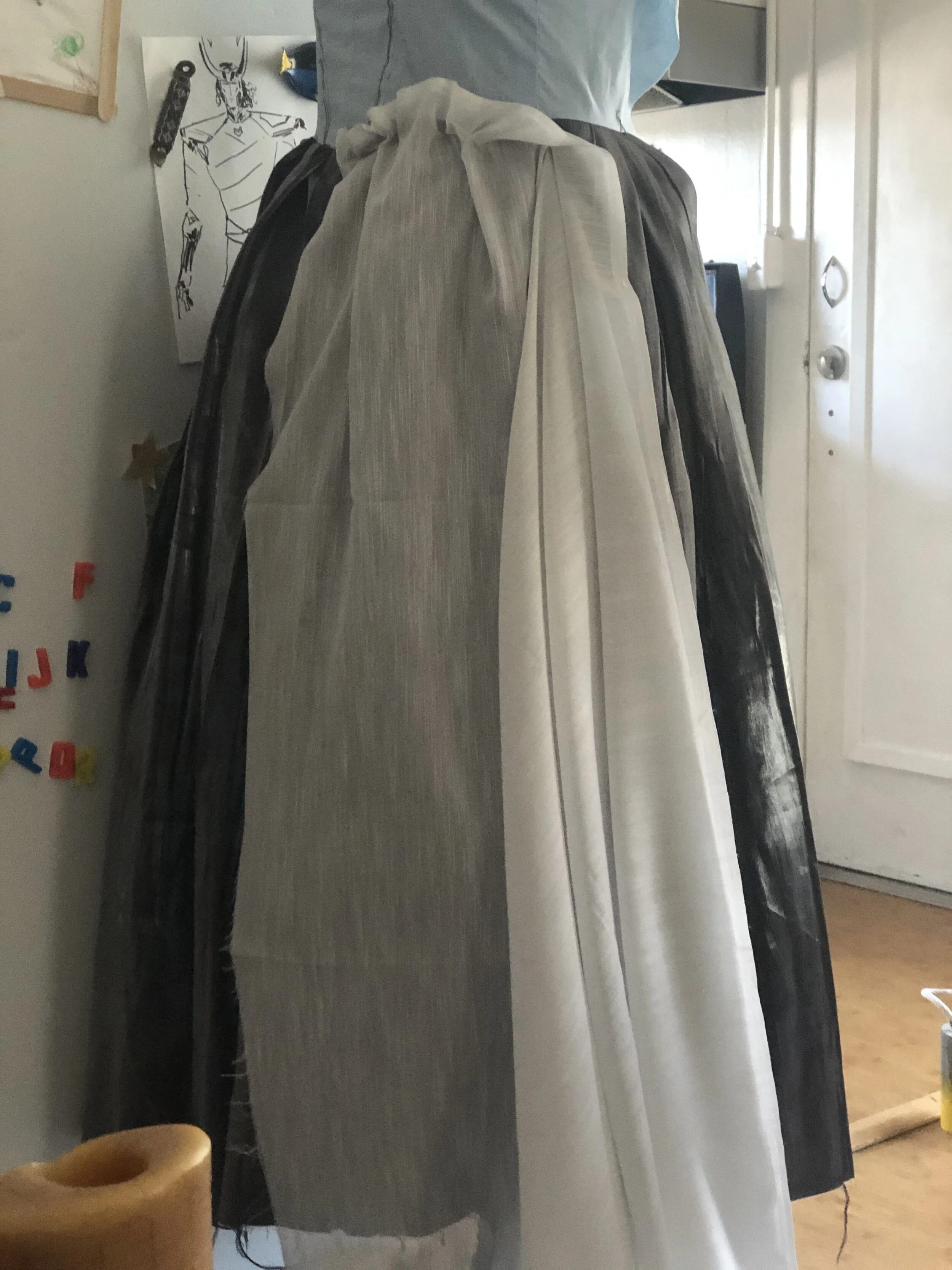 Once I had the fabric, it was mostly a simple project. Some effort was put into creating as much of the ballgown shape as I could without wearing a crinoline. Side note: crinolines create such a lovely shape, but they cause issues too. In another post, I’ll talk about lessons learned from Cons… one of them is no crinolines if you can help it. I ended up building a separate petticoat that I’m able to use for any ballgown I want in the future, so the effort is so worth it.